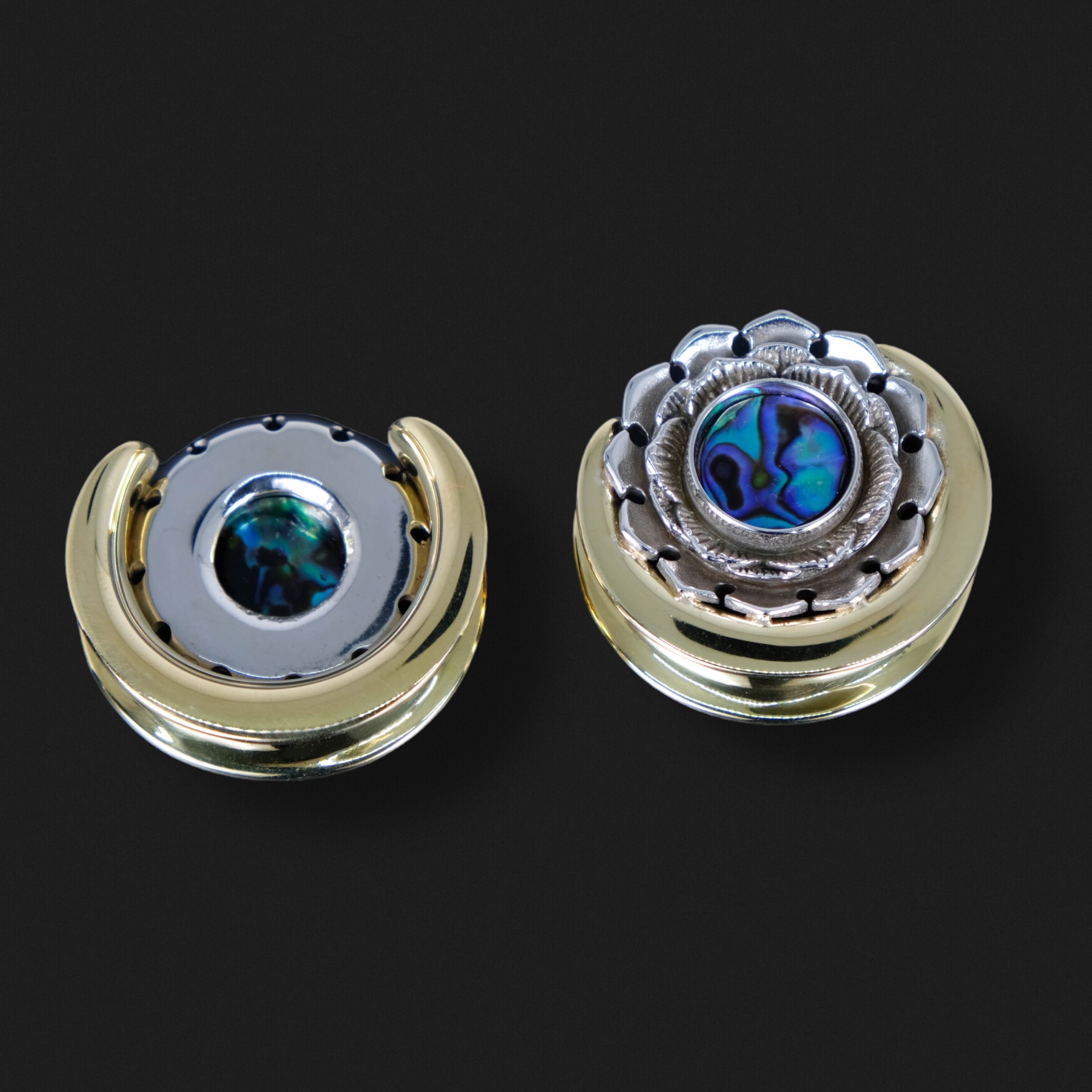 Gold Saddle Silver Seroja Plugs made by Brass (saddleplugs) and Silver inlayed with abalone sea shell.