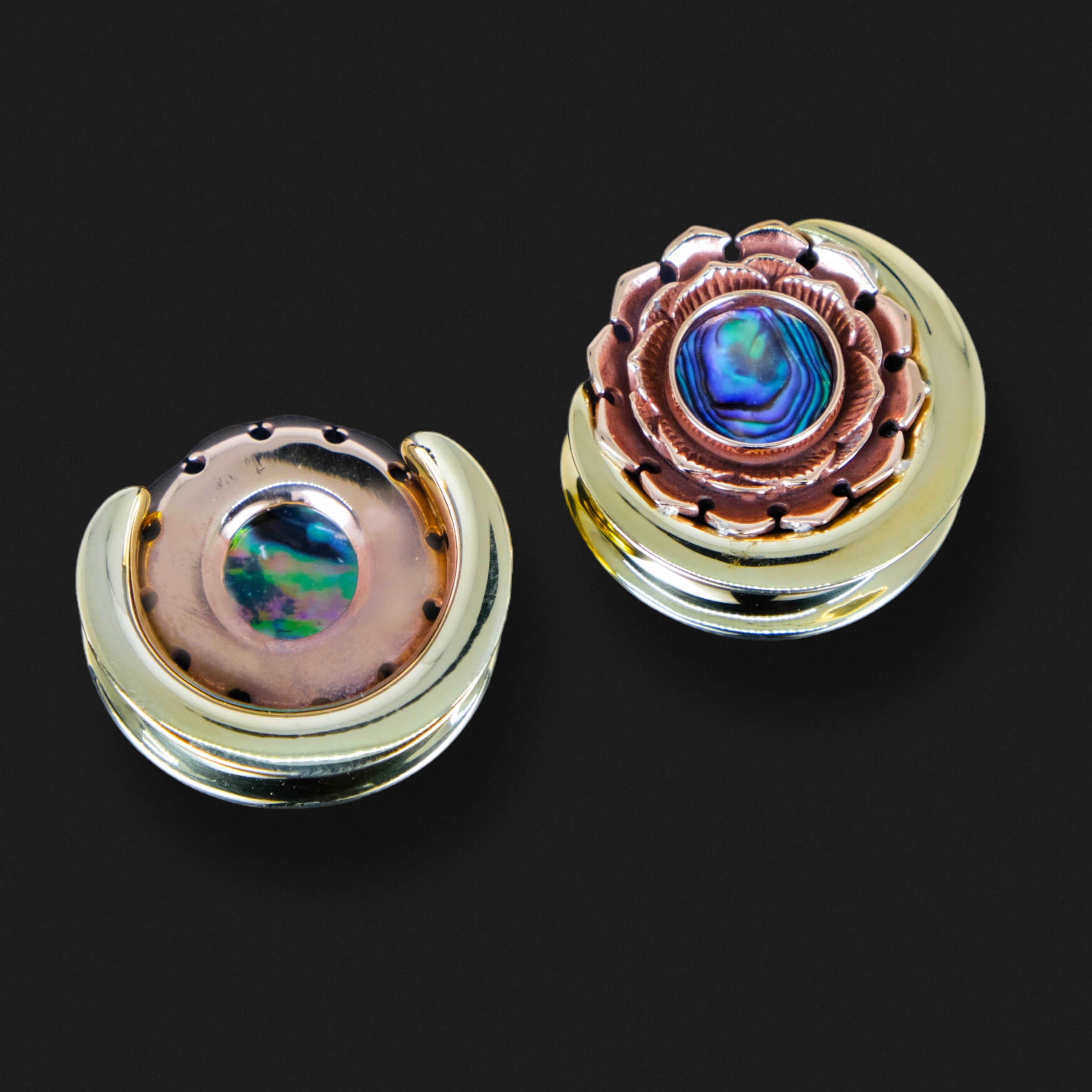 Gold Saddle Rose Seroja Plugs made by Brass (saddleplugs) and Copper inlayed with abalone sea shell.